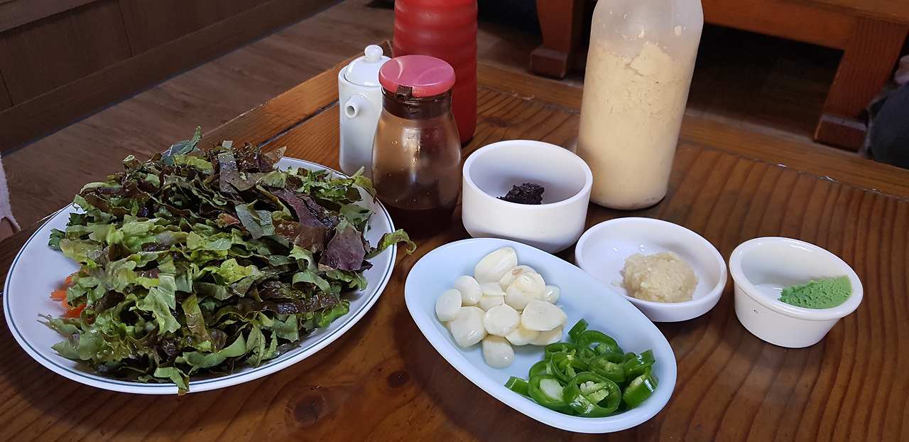 강원도산 배추 속에 야채를 얹고 송어회를 올린 다음 마늘과 청양고추를 강원도식 강된장을 찍어 쌈을 싸 먹는다.