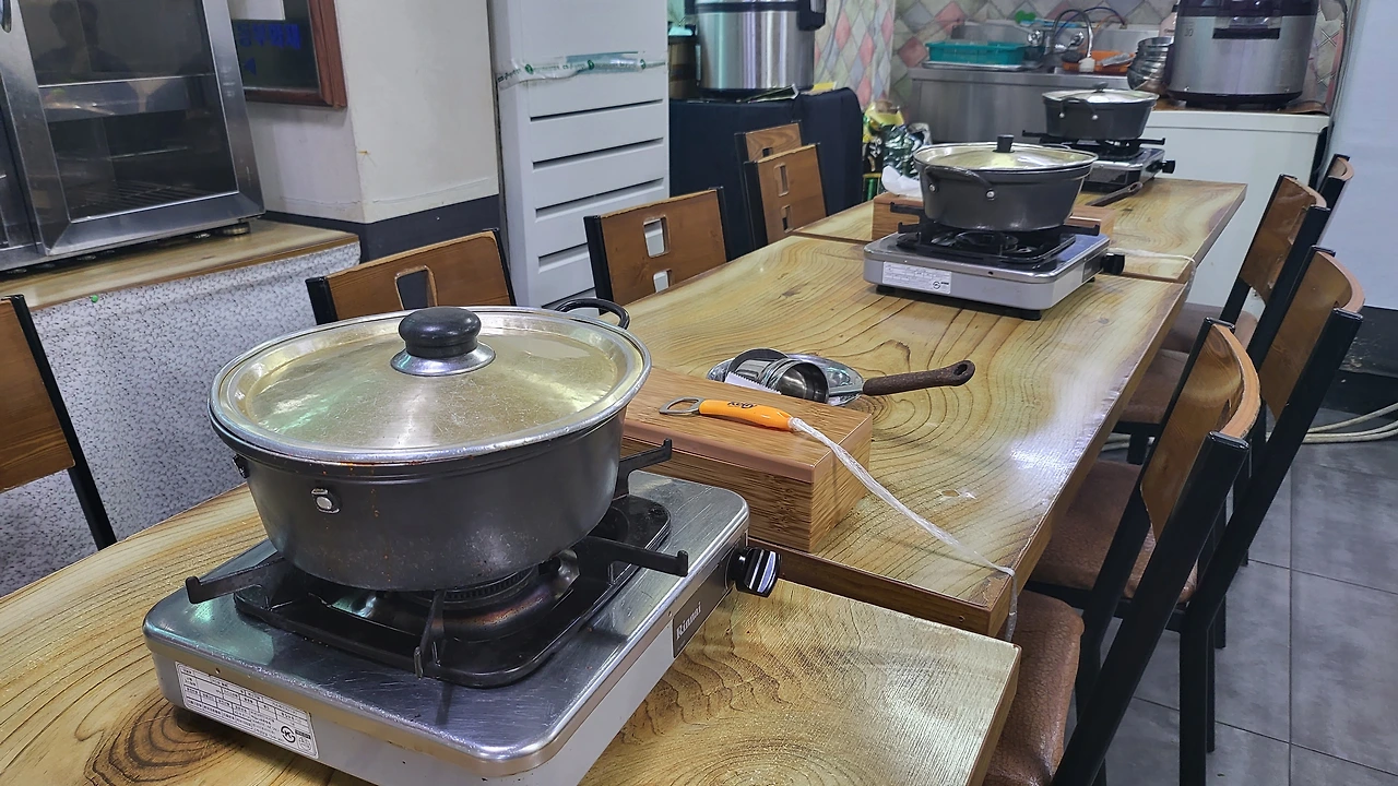 식당 내부로 들어서니 각 테이블마다 오래된 커다란 양은냄비가 하나씩 올려져 있다.