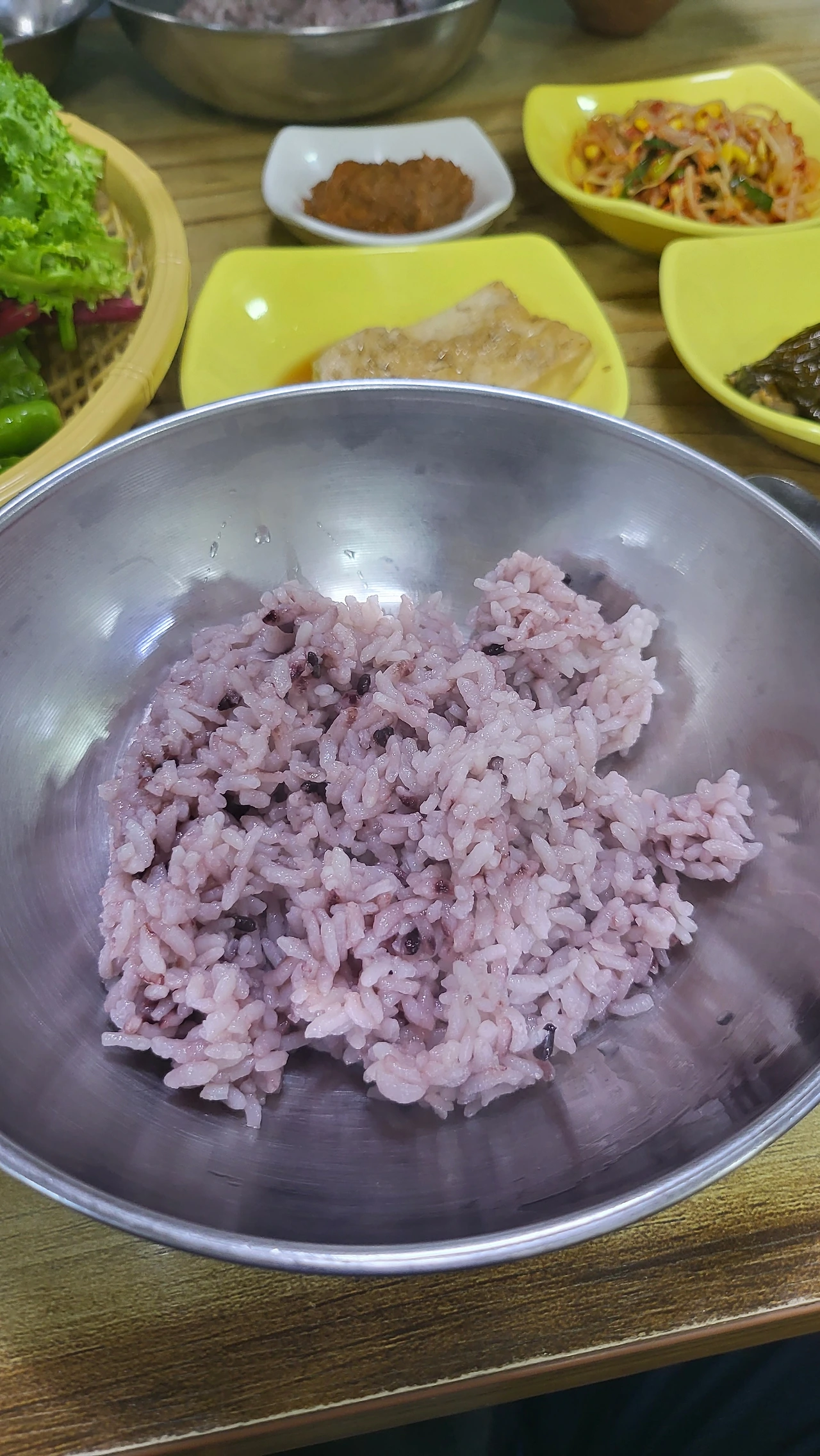 커다란 스테인리스 그릇에 흑미밥이 한가득이다.