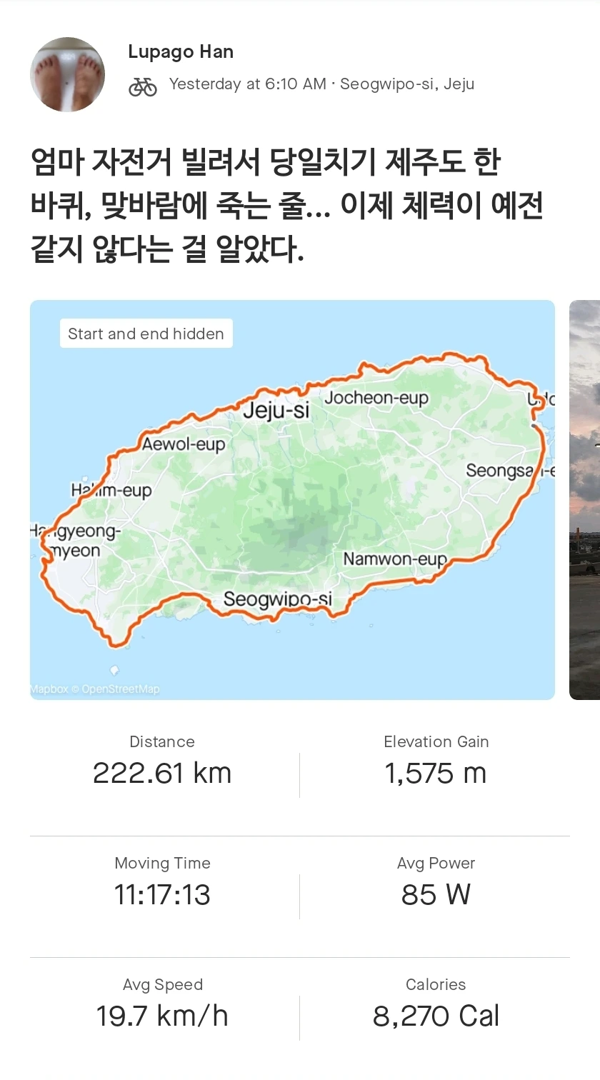 이번 라이딩을 포함해서 제주환상자전거길 종주를 네 번 했는데 이번이 제일 힘들었던 것 같은데, 어떻게 보면 인간을 망각의 동물이라 했던 것처럼 지난 고통을 잊었기 때문인지도 모르겠다.