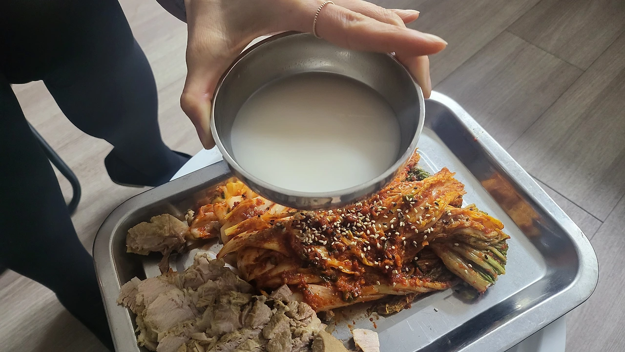 갓 담은 김장김치와 두툼한 보쌈에 막걸리 한 잔.