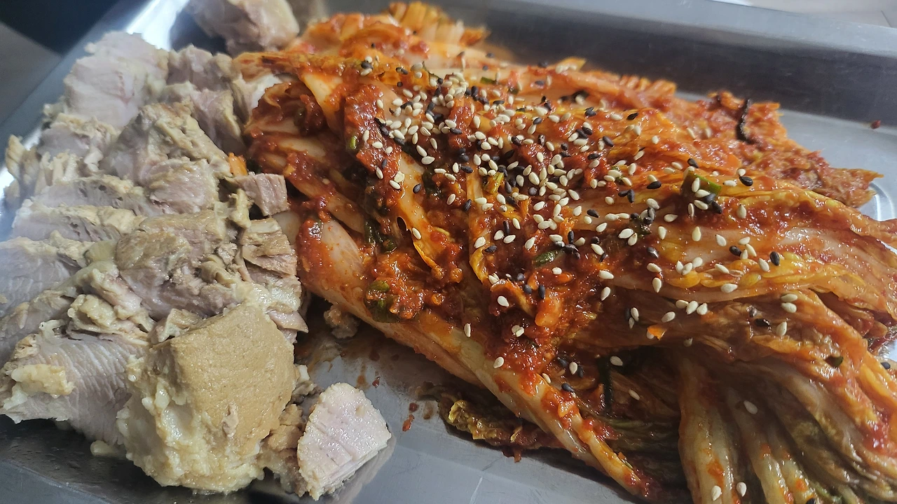 잠시 후 친구 한 명이 합류했고 김치에 보쌈이 차려지고 있었다.