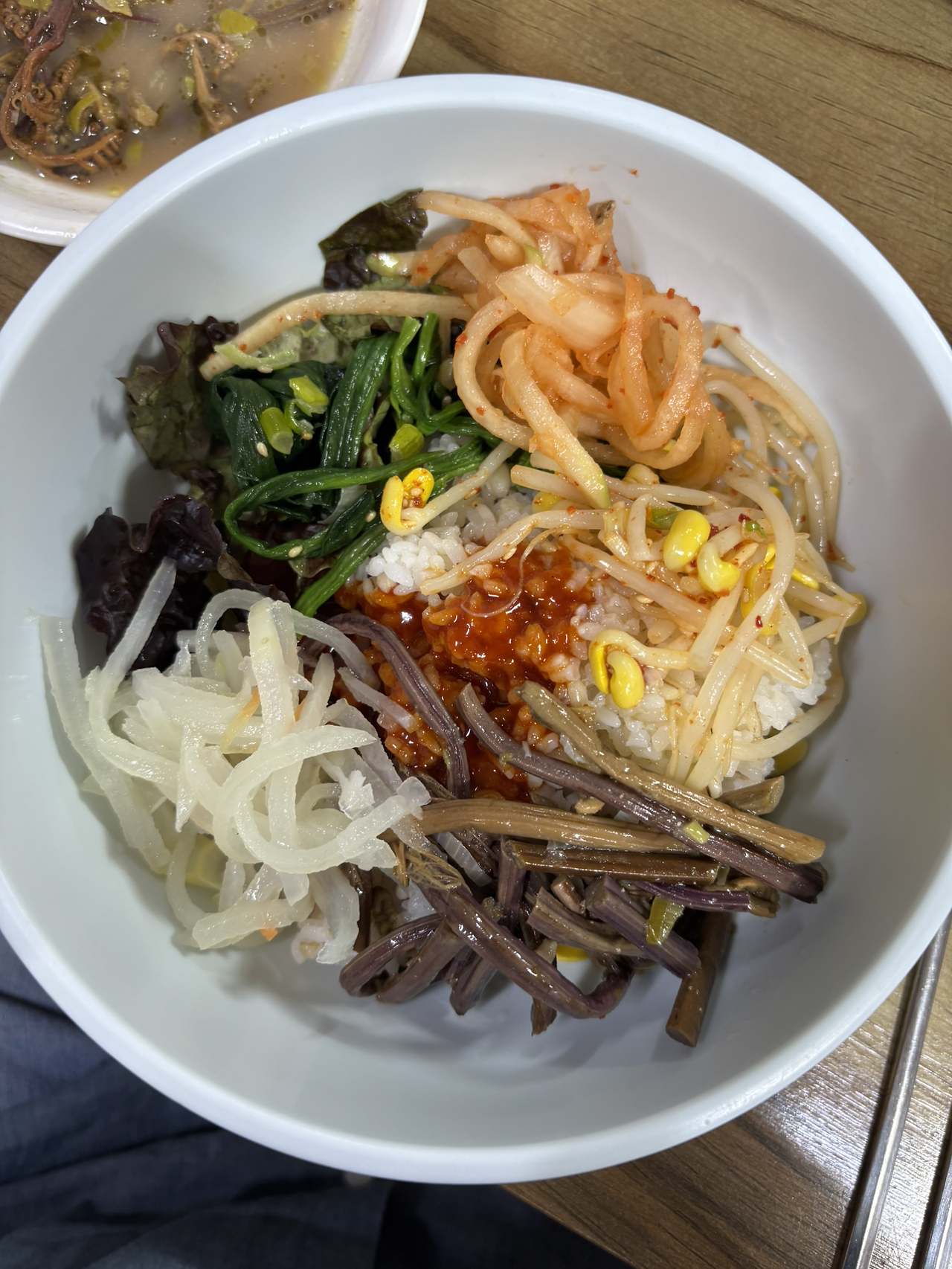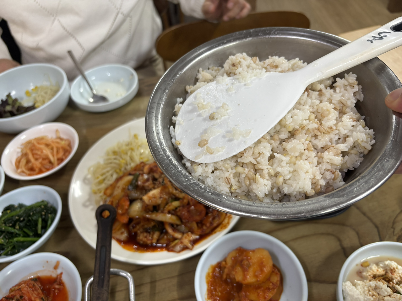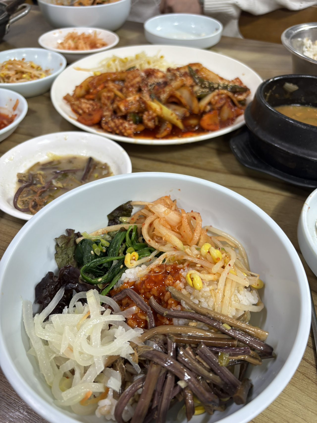 오징어볶음을 주문하면 이렇게 순두부, 된장국, 비빔밥이 준비된다.