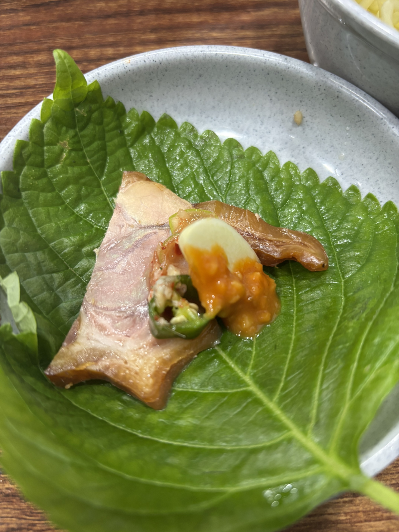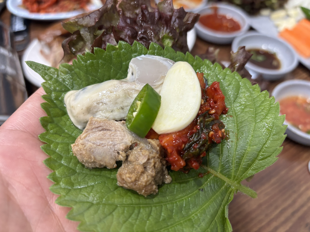 깻잎 위에 새우젓 찍은 족발 한 점, 쌈장 바른 마늘 하나, 청양고추 하나 올려 쌈을 쌌다.