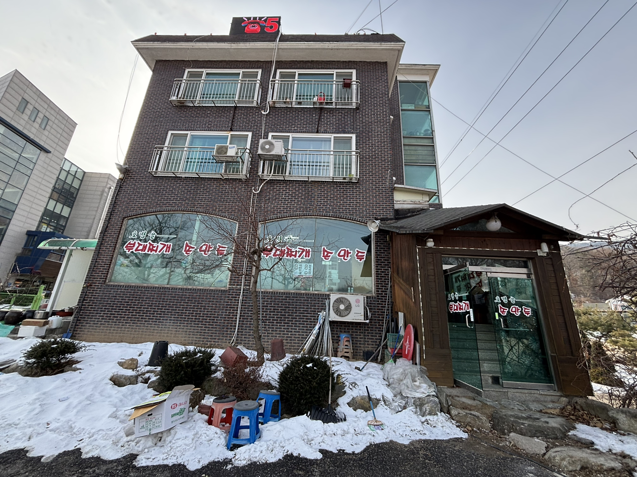 왕방산 아래 풍수지리가 좋아 포천에선 나름 고급주택이 들어선 곳이라는데 아무튼 부대찌개집 하나가 덩그러니 자리를 잡고 있었다.