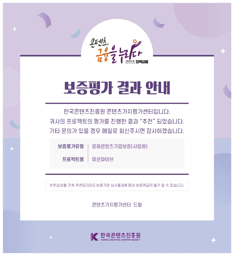 지난 4월에 한국콘텐츠진흥원에서 운영하는 콘텐츠가치평가센터에 문화콘텐츠기업보증 사업화 부문에 보증신청을 했다.