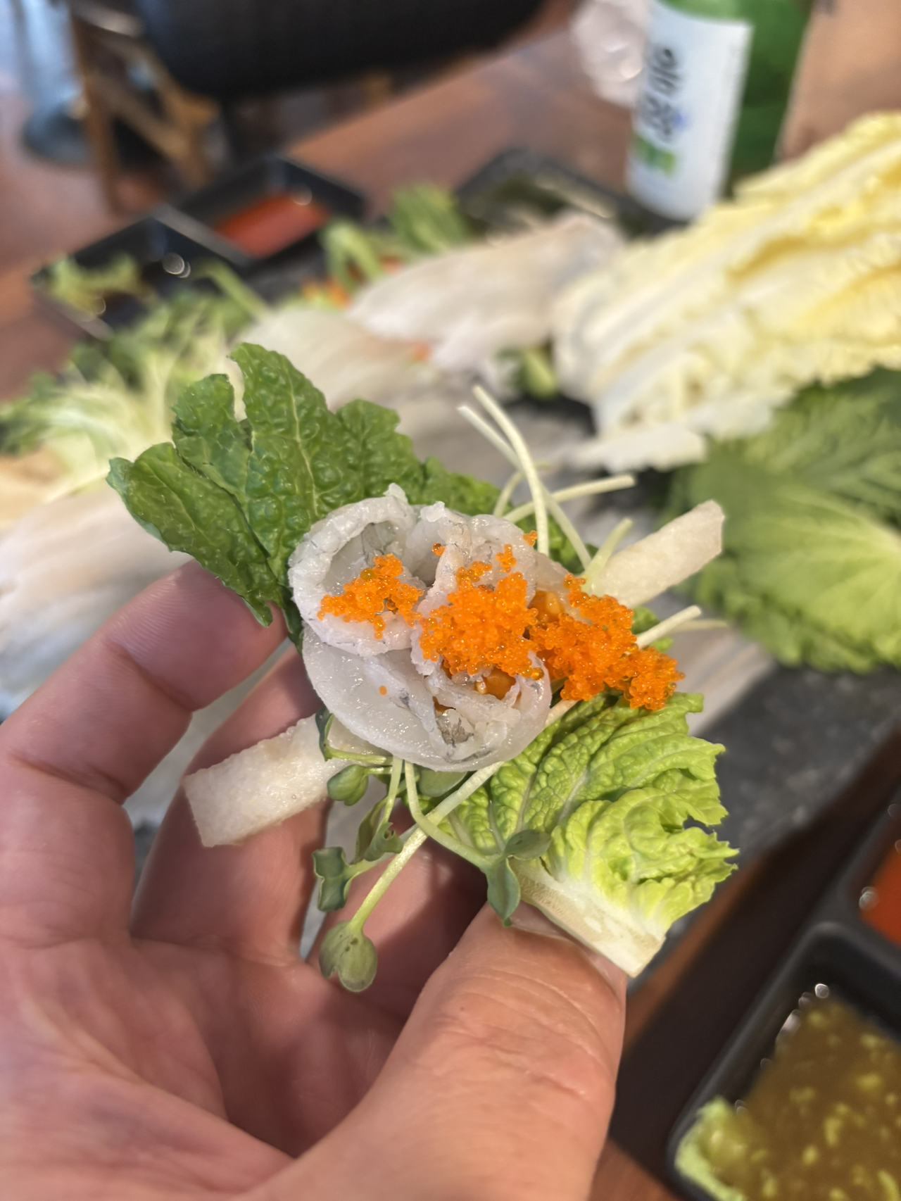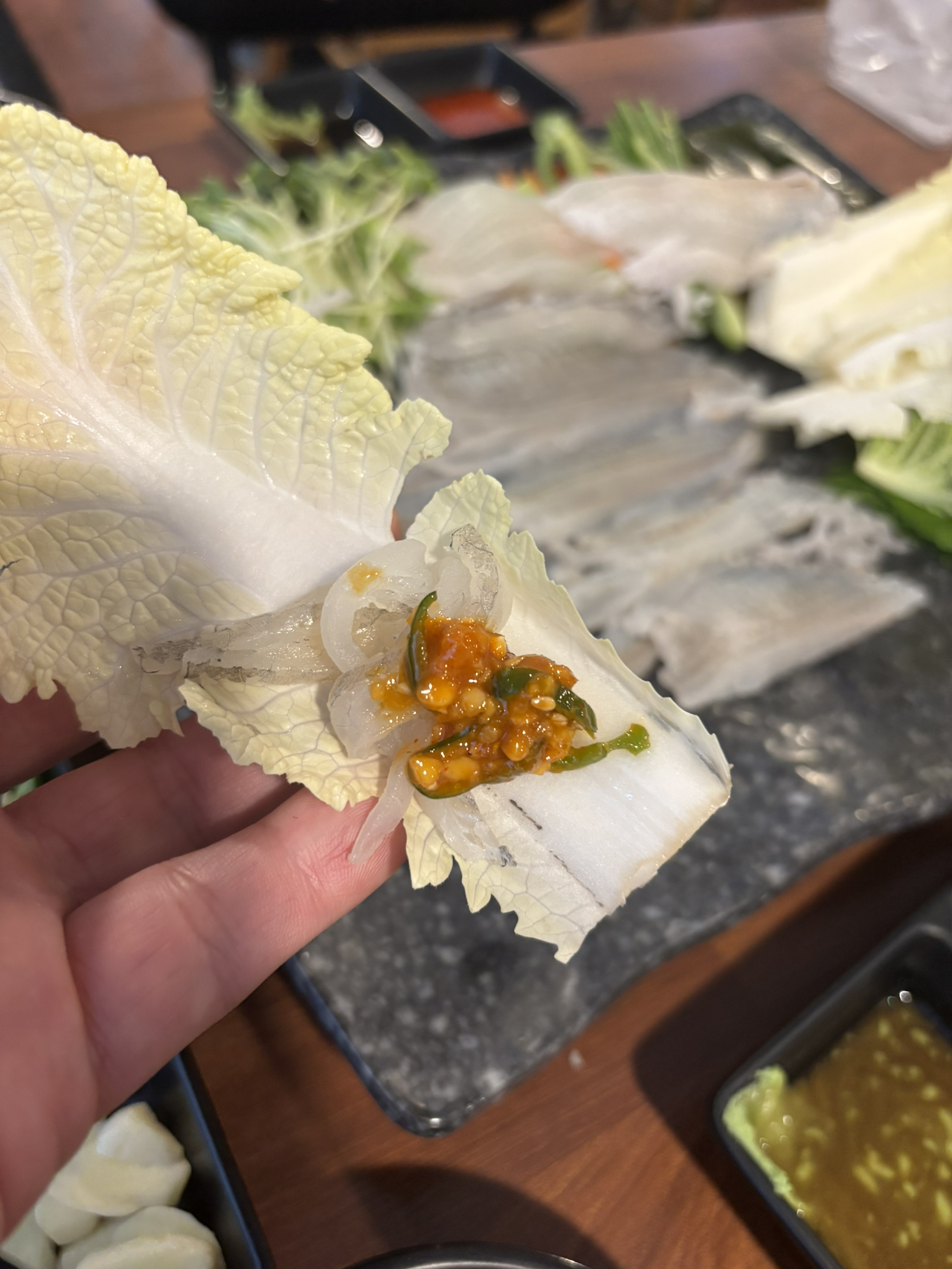 특히 배추속에 쌈장 가득 올리고 도다리 회를 몇 점 올려 먹으면 달달한 게 아주 기똥차다.