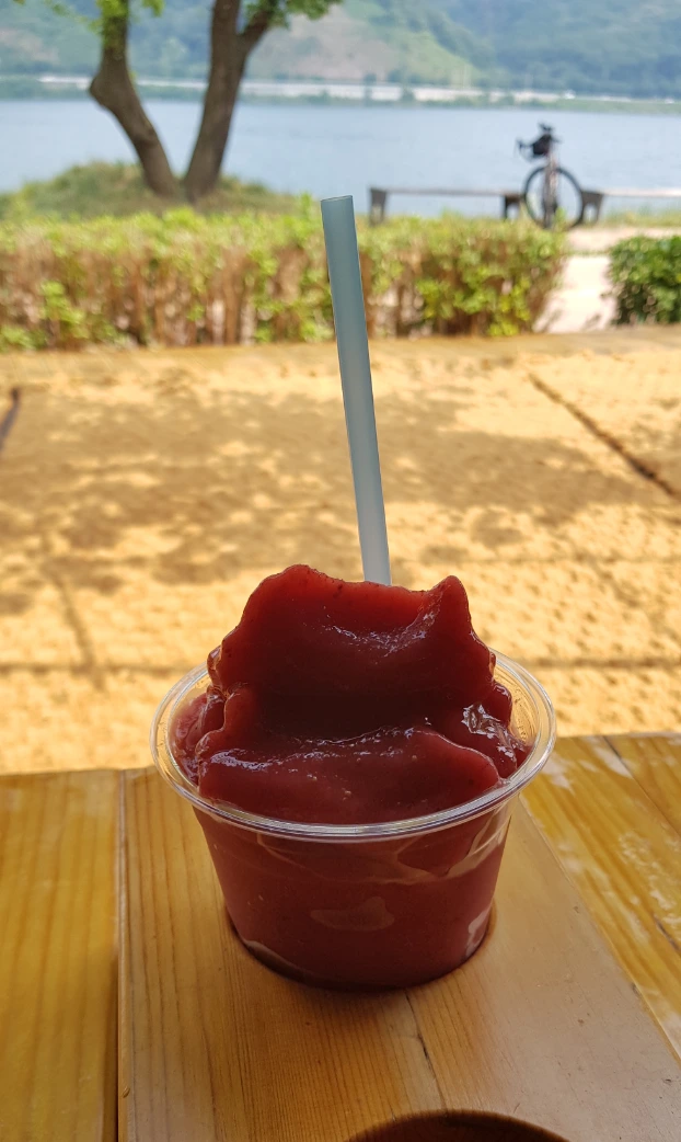 어쨌건 토요일 오후, 난 홀로 로드바이크를 타고 춘천 가는 자전거길 북한강 옆 포도농장에서 판매하는 딸기 스무디로 초여름을 얼리는 중이다.