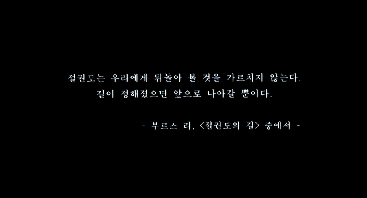 절권도는 우리에게 뒤돌아 볼 것을 가르치지 않는다. 길이 정해졌으면 앞으로 나아갈 뿐이다.