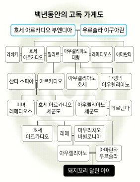 <백년 동안의 고독>은 5대에 걸친 부엔디나 집안의 번영과 쇠락을 다루는 계도(系圖) 소설이다. 부엔디나 집안 사람들은 가상의 마을인 마콘도를 설립해 마을 사람들의 존경을 받으며 살았다. 하지만 집시가 등장하며 새로운 문물이 유입되고, 있는지도 몰랐던 정부에 의해 오랜 내전을 겪고, 대형 바나나 공장이 설립되며 자본주의 물결이 휩쓰는 동안 에덴 동산 같던 마콘도는 황폐해져버렸다. 굴곡진 역사를 온몸으로 소화해내면서도 부엔디나 집안 사람들은 저주라도 걸린 마냥 끊임 없이 근친상간을 반복한다. 결국 근친상간으로 돼지 꼬리 달린 아이가 태어나며 부엔디나 집안과 마콘도는 현자 멜키아데스가 양피지 문서에 예언했던 대로 개미들에 먹혀 지구상에서 사라진다.