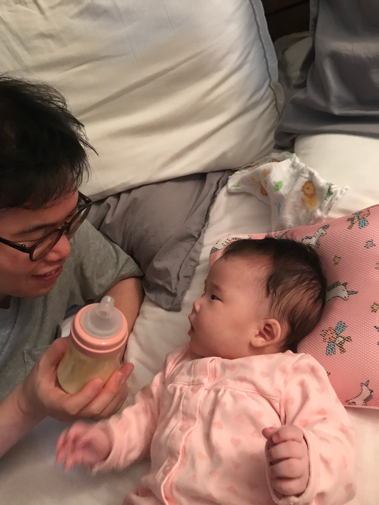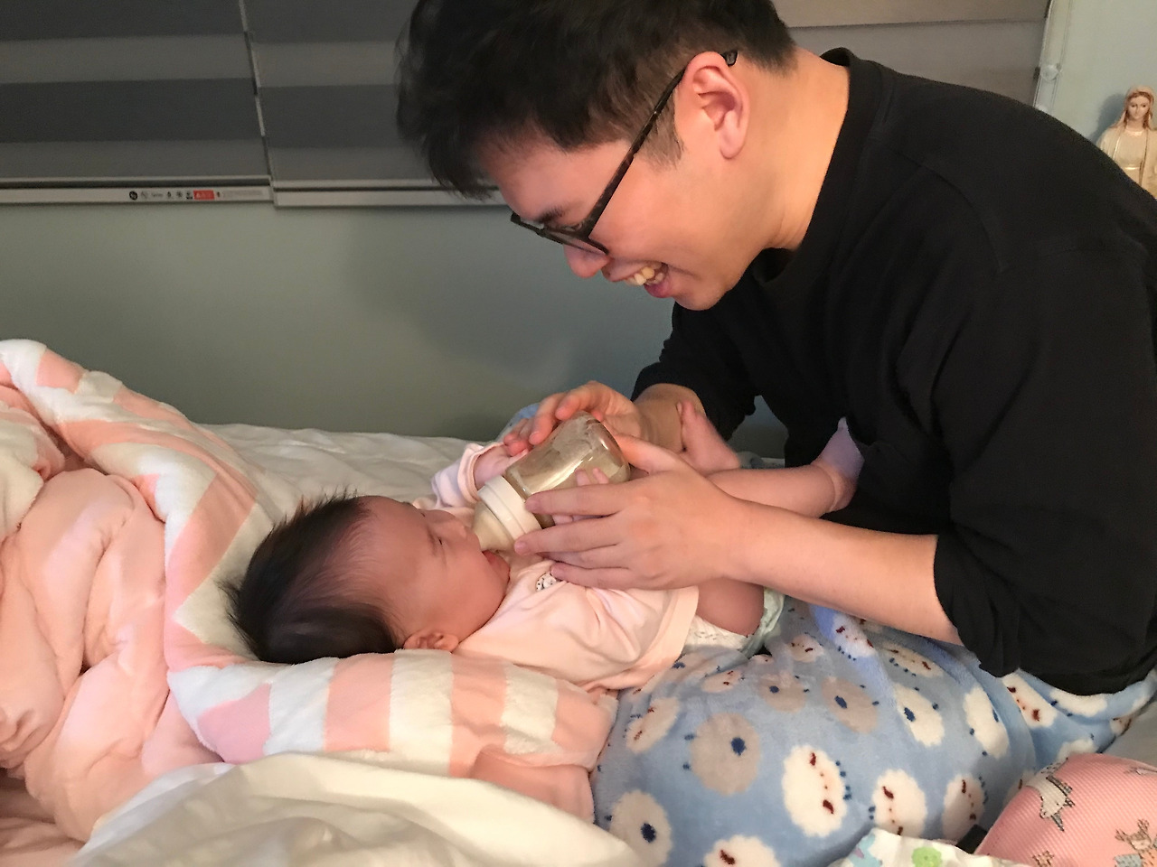 약간 시간이 흐르자 자기도 배가 고팠는지 살짝 분유병을 물었다. 일단 입에 넣었지만 삼키지는 않고 분유거품을 입에다 뽀글뽀글 만들었다. 마음 같아서는 이 분유꽃게를 게장 담가버리고 싶었지만 나는 아빠였다. 그래서 강아지들에게 하듯이 ‘아이 맛있어~ 아이 맛있어~ 아빠가 다 먹어야겠다’ 하며 먹는 척을 했다. 그리고 물리니 다시 좀 빨았다. 잘 먹는다 싶었더니 이번에는 분유를 옆으로 흘리고 있었다. 아니 애는 어디서 이런 뺑끼질을 배운 거지 싶었지만 다시 어르고 달래서 일단 먹였다.