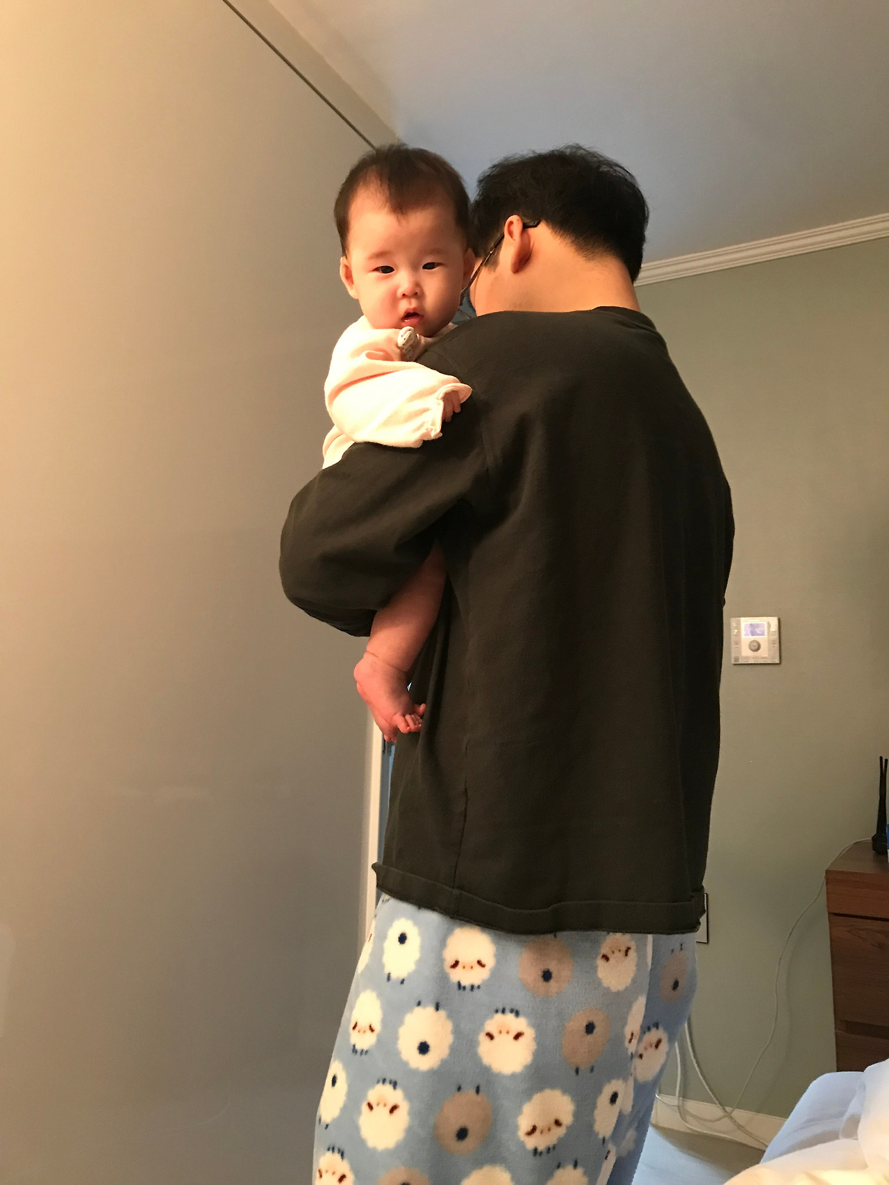 재하는 누워있기 싫어서인지 계속 칭얼거렸다. 나는 어쩔 수 없이 비몽사몽 재하를 안고 다시 거실로 나왔다. 딸이 ‘다시는 나를 내려놓지 마라’라는 뉘앙스의 옹알이를 하길래 대꾸했다.