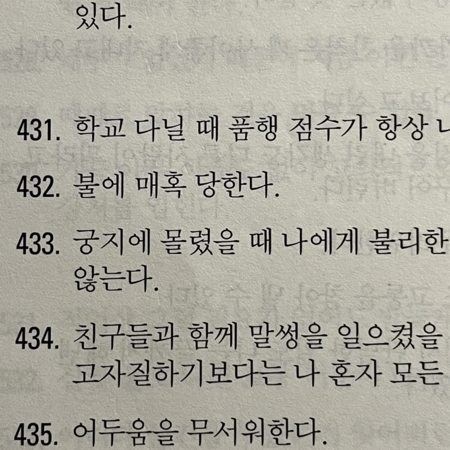 내원 당일, 진료나 상담 전에 구체적인 상태를 파악하기 위해 각종 검사를 진행했다. 그림을 그리기도 하고 퍼즐을 맞추기도 하며 단어를 떠올려야 하는 문제를 풀기도 했다. 세 시간이 넘는 검사들을 모두 마친 뒤, 무기력과 우울감은 낮지만 불안감이 다소 높은 상태라는 진단을 받았다. 의사는 불안이 높으면 강박감이 생기기 쉽고(실제로 당시 결벽증이 있었다), 이는 업무 효율을 떨어뜨려 결과가 나쁠 때 자기비판적인 태도로 이어진다고 했다. 이 패턴이 다시 불안감을 높여 악순환의 고리가 된다고 덧붙였다. 나는 엄마 따라 용한 점집을 찾아간 것처럼 그녀의 말이 맞는 말이라고 느끼면서도 남의 진단 내용을 훔쳐 듣는 것처럼 심드렁했다. 그녀에게 내 모든 문제의 원인을 이야기할 수는 없다고 내심 생각했던 것 같다.