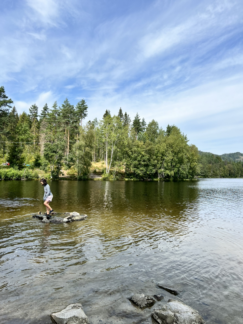 글의 영감을 위해선 안 하던 일도 해보고, 귀찮은 일도 해보고, 미루던 일도 해봐야 한다는 생각이 떠올랐다. (feat. 아티스트 웨이) 남편이 잠깐 자리로 돌아온 틈에 나도 수영을 해 보겠다고 선언했다! 내가 주섬주섬 옷을 갈아입고 호수에 뛰어들 때까지도 남편은 내가 물에 뛰어들지를 의심하는 표정이었다. 보란 듯 물로 점프! 노르웨이 산 속 호수 물의 차가운 기운이 스며들기도 전에 바로 후회했다. '윽. 이건 아니야. 너무 차가운데! 다시 나가야겠다.' 그 순간, "엄마, 다이빙 세 번은 하고 와!"라고 소리치는 딸의 말이 들린다. 떨리는 두 입술을 깨물고 수영을 시작했다.