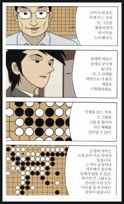 이렇듯 모든 일은 연결되어 있습니다. 마치 바둑의 한 수 한 수처럼 말이죠. 한 사람이 맡은 일은 다음 단계의 시작이 되고 그런 사슬들이 이어져 하나의 성공이 됩니다. 결국 큰 성공을 이루기 위해서는 1)각 단계의 연결 고리를 명확히 하고 2)진행 상황을 정확히 모니터링하고 3) 실패를 거울 삼아 새로운 계획을 세워 다시 나아가야 가야 합니다.