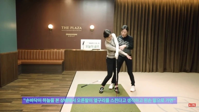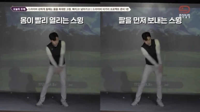 이러니 조금만 늦게 맞으면 슬라이스 구질이 나고, 너무 앞에서 맞으면 왼쪽으로 훅 구질이 나는 와이파이 방향성을 보이게 되더군요. 점심 식사 후 쉬는 시간에 휴게실에서 이런 고민을 이야기했는데 구력이 꽤 되시는 선배님께서 이런 말씀을 하셨습니다. “골반을 회전시켜 주는 거랑 어깨를 포함한 상체가 열리는 동작이 꼭 같을 필요는 없어요. 오히려 상체는 잡아줘도 골반은 열어 줘야 헤드가 더 앞으로 나가게 던질 수 있게 됩니다.”