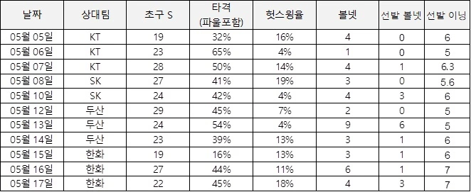 특히 초구에 승부를 거는 비율이 너무 높습니다. 지난 2주 간 승부에서 초구에 스트라이크가 들어 왔을 때 스윙이 나간 경우를 모아 보았습니다. 보시면 대부분의 경우가 50%를 넘어 갑니다. 그러니 긴 승부가 날 수가 없고 선발 투수로부터 볼넷도 적게 뽑아 내니.. 상대 선발을 5회 이전에 강판한 적이 없었습니다.