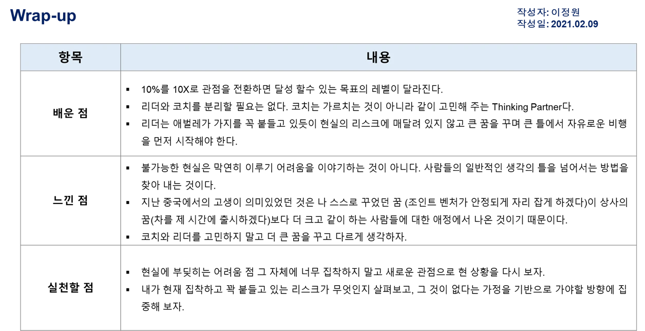 이런 고민들을 가지고 들어간 첫 수업에서 코치님이 이런 이야기를 해 주셨습니다. 굳이 리더와 코치를 구분할 필요가 없다시며, 코치는 가르치는 것이 같이 아니라 같이 고민해 주는 Thinking Partner라고 말이죠.