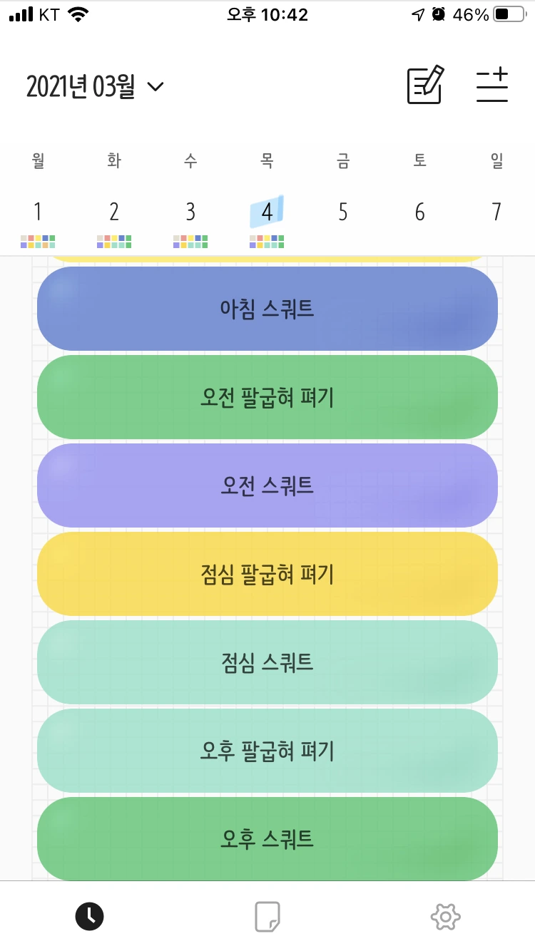 두 번째는 이런 과정들을 기록하고 했는지 안 했는지를 어플을 통해서 중간중간 체크했습니다. 물론 매일 다 할 수는 없지만 되도록 하루 일과 도중에 그리고 자기 전에 실제 진행 정도를 확인하고 보충할 수 있으니까요. 나 자신과의 약속이라 생각하고 하나하나 채워 가는 과정이 무척이나 즐거웠습니다.
