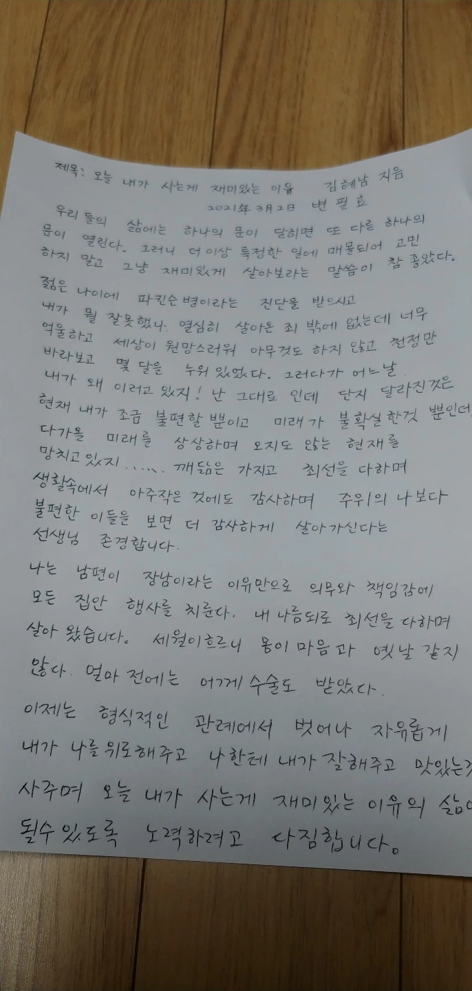 오랜만에 자식들 얼굴을 봐서 그런지 처음 글쓰기를 시작했을 때 보다 많이 밝아 지신 부모님의 모습이 반가운 저는 그래서 다녀온 이후에 조금은 용기를 내어 부모님께 숨겨 두었던 주제를 꺼냈습니다. 김혜남 박사님의 “오늘 내가 사는 게 재미있는 이유”, 바로 ‘파킨슨 병’에 대한 이야기입니다.