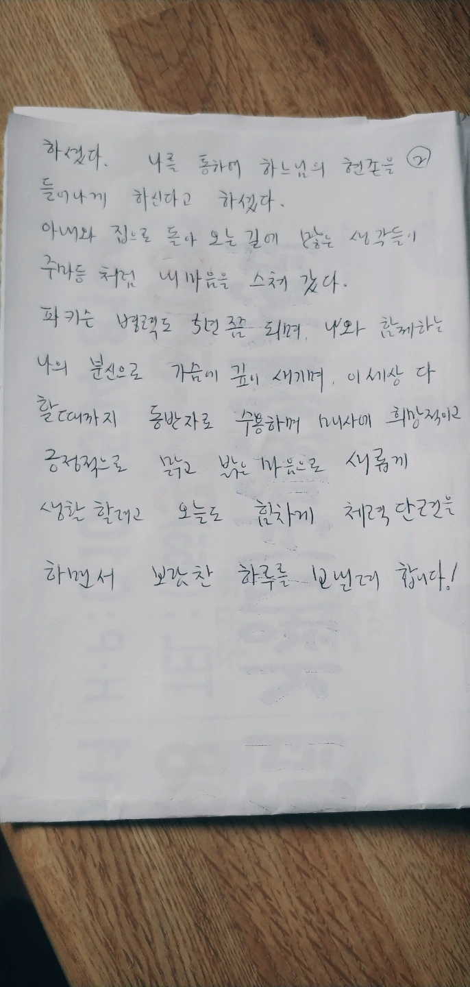 아내와 집에 돌아오는 길에 많은 생각들이 주마등처럼 제 머리를 스쳐 갑니다. 파킨슨 병력도 5년쯤 되면서 어느덧 나와 함께 하는 나의 분신처럼 여겨집니다. 신부님 말씀을 가슴에 깊이 새기며, 이 세상 다 할 때까지 동반자로 수용하며, 매사에 희망적이고 긍정적으로 맑고 밝은 마음으로 새롭게 생활하려 합니다. 오늘도 힘차게 체력 단련을 하면서 보람찬 하루를 보내 봅시다.