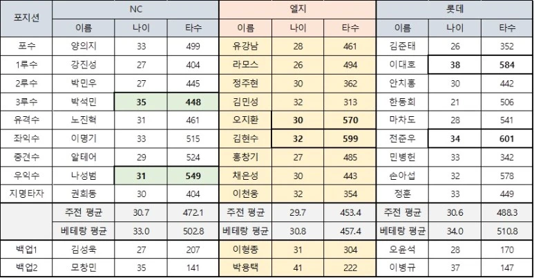 그런데 롯데는 일단 34살 전준우의 600 타석이 눈에 뜁니다. NC엔 3명, 엘지에는 단 두 명씩 밖에 없는 500 타수 이상 선수가 다섯 명이고 있습니다. 베테랑 평균이 34세로 주전 평균과 3살이상 차이가 나는데 평균 타수는 세 구단 중 1위입니다. 사실 막판에 부상과 부진으로 안치홍 민병헌이 빠지지 않았다면 더 됐을 겁니다. 한마디로 한동희 / 김준태 / 마차도를 제외한 여섯 자리는 30대 중반 이상의 고참들이 계속 눌러 앉아 있었다는 뜻입니다.
