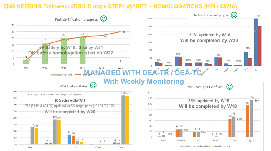 중국에서 전기차를 만들 때 유럽 기준 품질을 중국 협력 업체와 맞추는 일이 진도가 나가지 않아 난관에 부딪힌 적이 있습니다. 차량 출시를 위한 인증 서류를 내야 하는 기한은 다가오는데 부품에 대한 품질 보증 서류와 검증 시험, 재질의 안전 성분에 대한 증서, 개발 중 발견한 문제에 대한 해결 리포트 등이 몇 주 째 진척이 없었습니다. 그래서 다음과 같이 Action Plan을 세웠습니다.