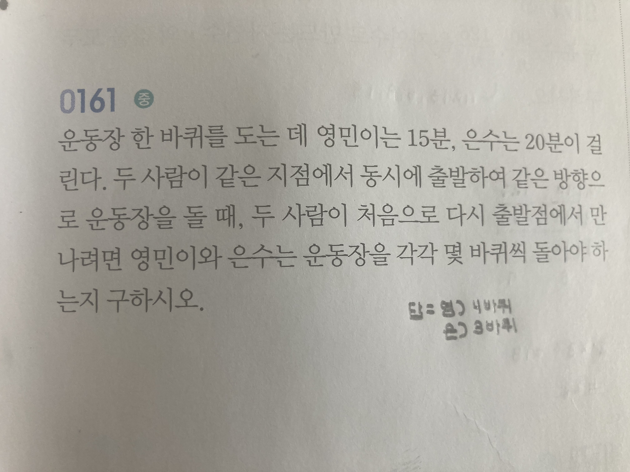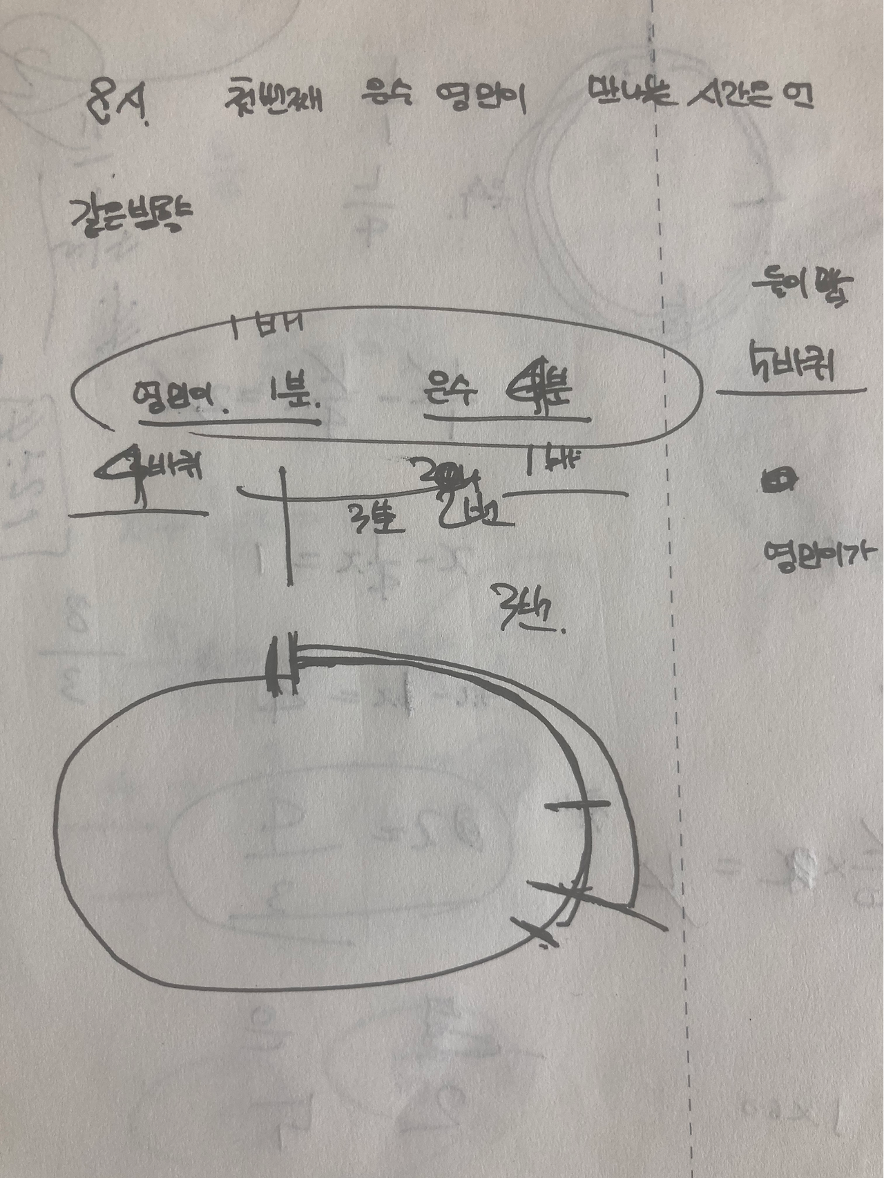 그러고는 머릿속 상상만으로는 잘 그림이 안 그려지는 아이와 연습장에 원을 그리고 바둑알을 돌려 가며 시뮬레이션을 해 봤다. 소인수분해와 아무 상관없지만 그렇게 노는 사이에 거리와 시간, 속도와의 관계. 마주치는 순간의 상황에 대한 상상과 이해를 한 번 맛 본 경험이 쌓였으리라. 그런 놀이를 같이 할 수 있어서 참 좋았다.