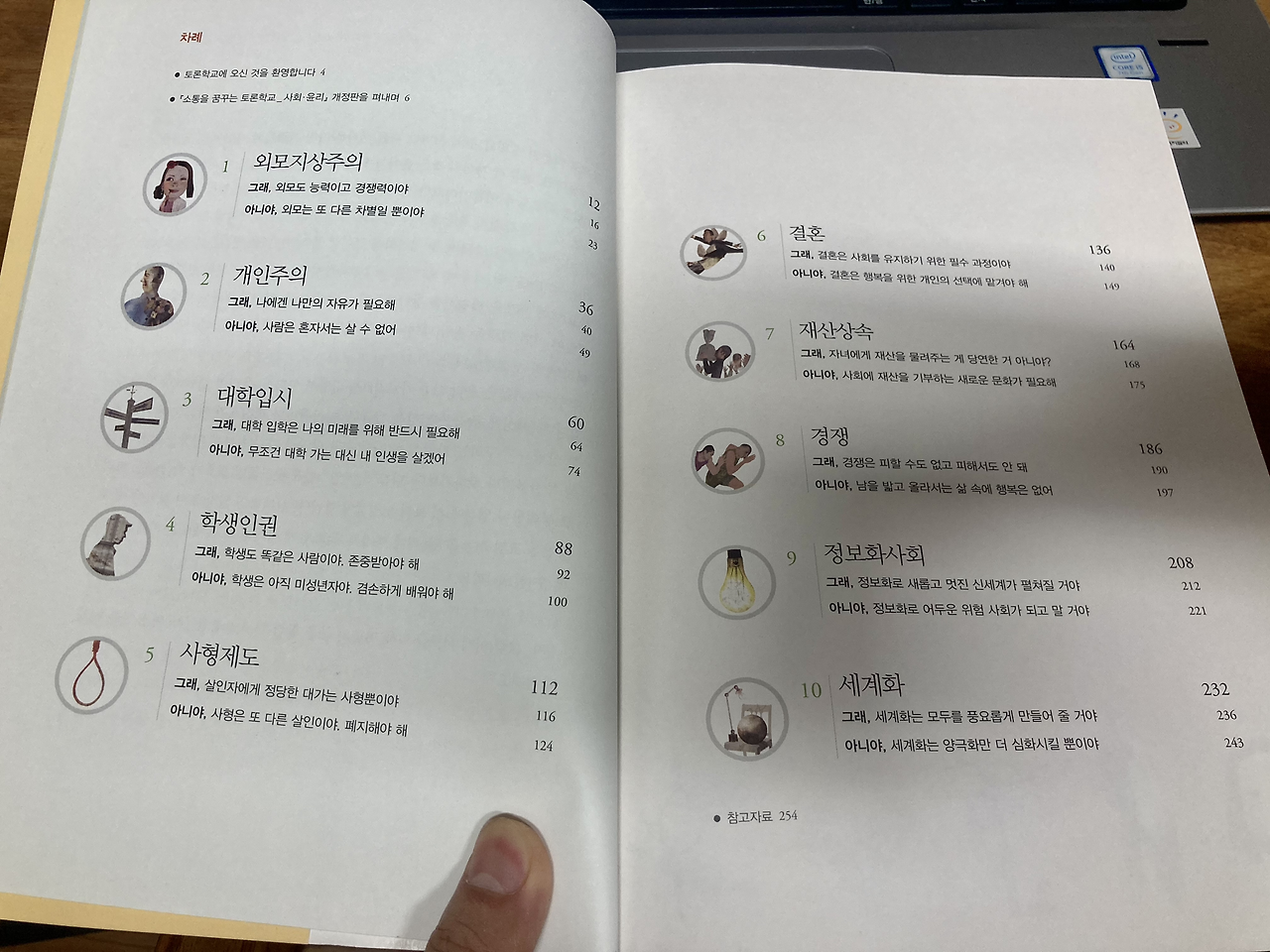 중학교 문제집을 고르러 아이와 함께 교보문고를 들렀을 때다. 아이는 이런저런 참고서나 문제집을 열심히 찾아보고 있는데 내 눈에 들어온 책이 한 권 있었다. "소통을 꿈꾸는 토론학교 - 사회 윤리".