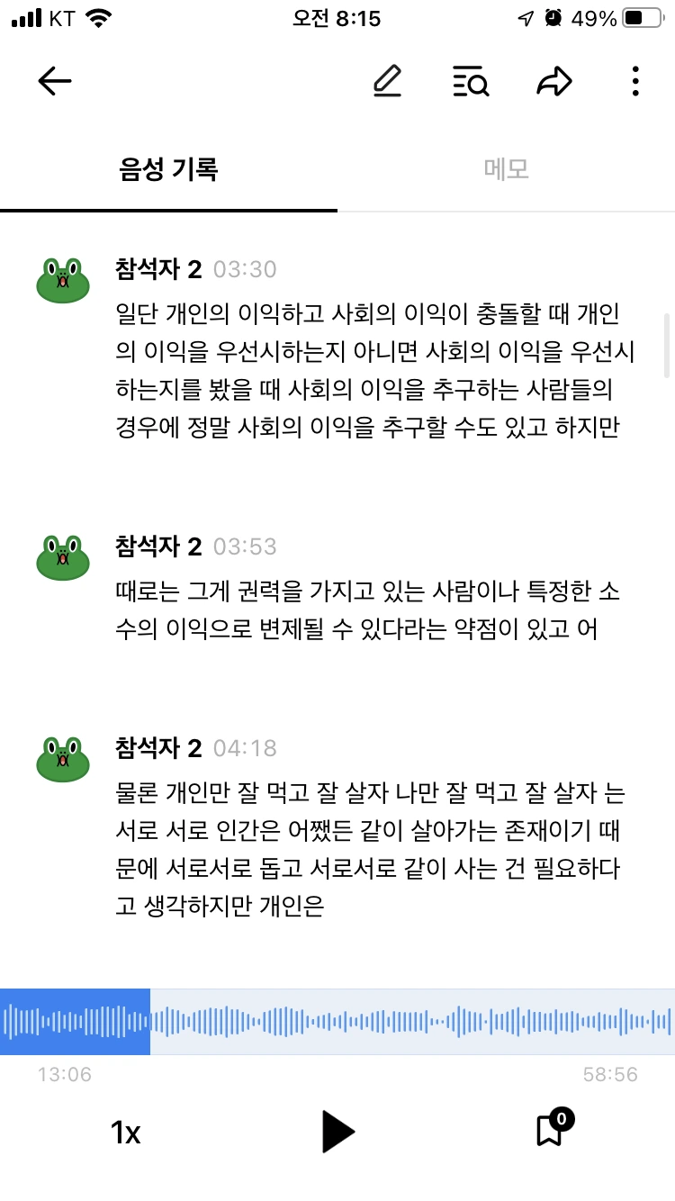 이 글을 쓰면서 지난 토론을 다시 들어 보니 내 이야기를 너무 많이 한 것 같다. 말은 더 줄이고, 수인이 이야기에 일단 긍정해주는 리액션을 늘려야겠다. 과외라고 제목에는 썼지만 사실 같이 토론하면서 나도 배운다. 좋은 책을 만난 덕분에 사회 윤리 문제에 대해서 고민해 보는 시간이 무척 즐겁다. 잘 마무리하고 다른 주제로 확장해 가며 꾸준히 해야겠다.