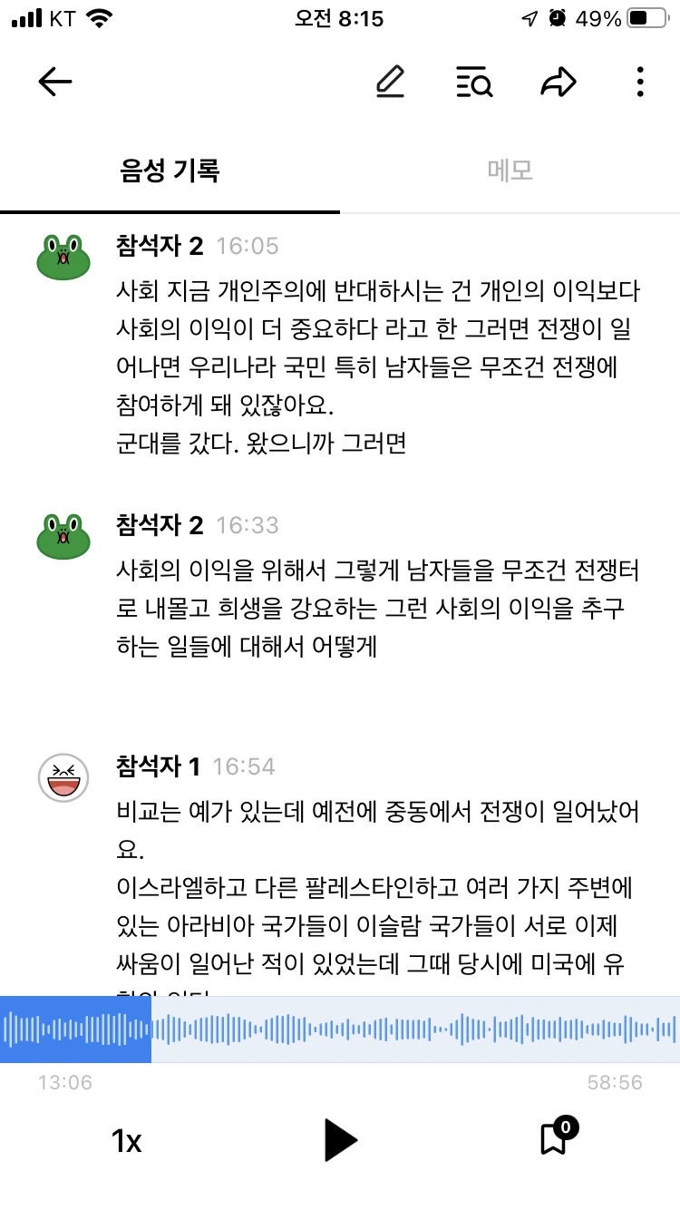 처음에는 3분간 발제 시간으로 내가 왜 찬성 혹은 반대하는지를 각자 이야기한다. 그러고 나서 서로 반박하기 위한 질문을 3개 정도 주고받으면서 토론을 이어 가면 30분 - 40분 정도 지난다. 어느 정도 질의하고 답하는 과정을 마치고 나면 나도 토론 상대자로서의 부캐 역할을 벗고 본캐의 생각과 입장을 꺼내면서 자유롭게 주제에 대한 이야기를 이어 나가고 있다.