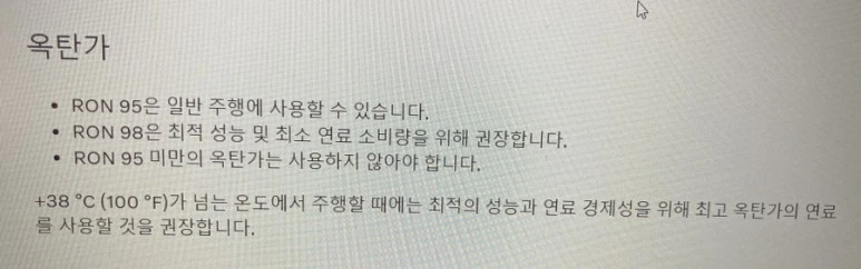 그러니 자유로에서 지옥의 레이스를 즐기거나 엄청 더운 여름에 태백산 고갯길을 빠르게 오르는 주행을 자주 하는 분이 아니라면 비싼 돈 들이지 말고 일반 휘발유로도 충분히 안전한 주행을 즐길 수 있다. 다만 수입 회사들마다 한국만을 위한 튜닝을 따로 하는 경우도 있고 보증 정책이 다르니 유저 매뉴얼을 참조하기를 권한다.