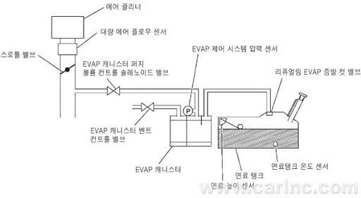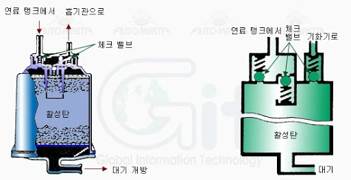 일단 연료 탱크의 압을 외부와 동일하게 하지 위해 외부에 연결되는 관이 있고 그 사이에 나가는 증발 가스를 붙잡아 둘 수 있는 캐니스터라고 하는 필터가 장착되어 있다. 숯과 같은 활성탄으로 구성되어 있는데 공기를 거쳐서 나가는 연료를 대부분 잡아 주면서 외부로 가솔린 가스가 유출되는 것을 막아 준다.