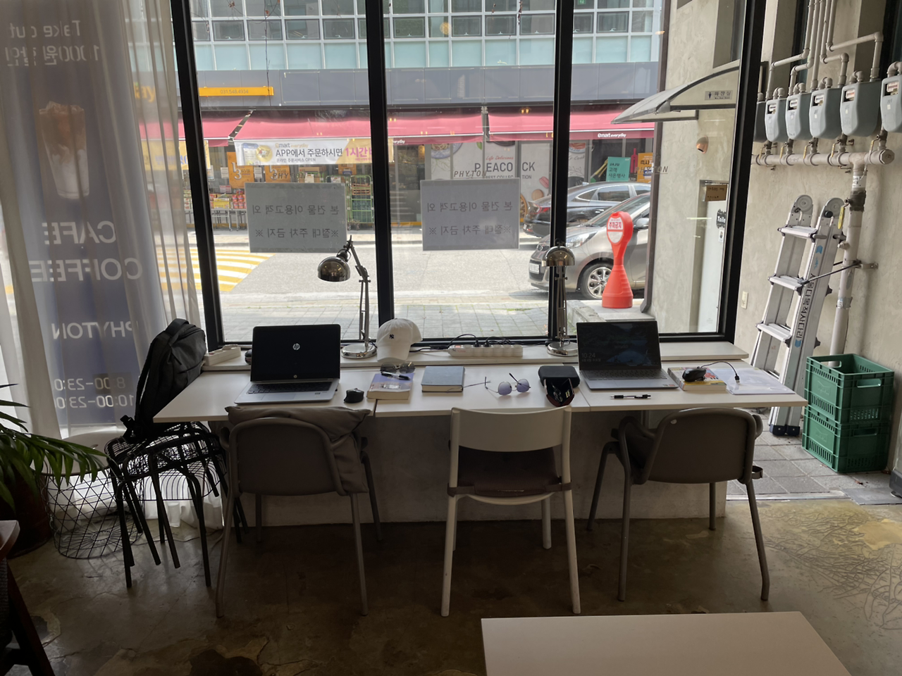 그러다가 우연히 들어간 집 앞 카페에서 마치 우리를 위해 준비해 둔 것 같은 자리를 발견했다. 나란히 앉아서 각자 일을 할 수 있는 구조가 좋았다. 적당한 볼륨의 카페 음악을 들으면서 우리끼리 이런저런 이야기하기도 좋고 답답하면 앞에 있는 놀이터에 가서 햇빛을 쐬며 스트레칭도 할 수 있는 위치도 너무 좋았다. 사장님께 우리 의도를 말씀드렸더니 아침에 오셔서 쓰시면 아무 문제없다고 배려해 주셨다. 덕분에 쾌적하고 아늑한 우리의 아침 사무실이 생겼다.