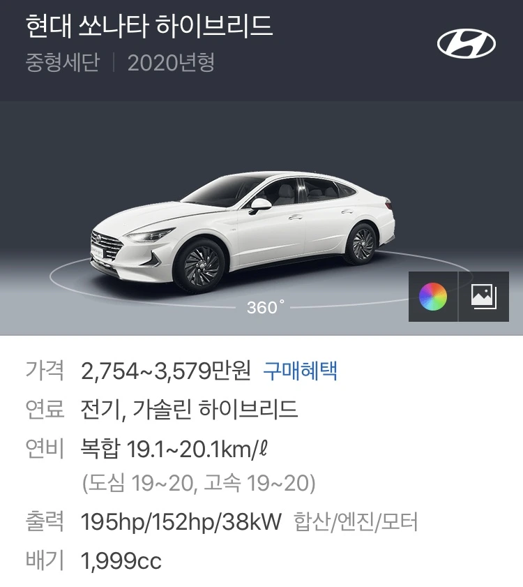 주변을 보면 하이브리드 차량 비율이 정말 많이 늘었습니다. 연비도 좋고, 친환경이라는 의미가 있죠. 대신 가격이 비쌉니다. 소나타 1.6 터보 가솔린이 연비 13.5에 프리미엄이 2700만원이고 2.0 가솔린이 연비 13.1에 2630만원인데 같은 급인 하이브리드는 연비 19.6에 2960만원이니 평균적으로 300만원 정도 더 비싸다고 나옵니다.