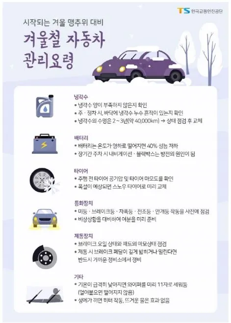 이 외에도 추워지면 챙겨 봐야 할 부분에 대해서는 한국 교통안전 공단에서 잘 정리한 내용을 참조로 보탠다. 자동차 시험을 하러 돌아다니면서 깨닫는 면이 사람이 힘들면 차도 힘들다. 미리미리 잘 점검해서 나만의 공간으로 따뜻하게 이동할 수 있게 도와주는 자동차와 추운 밖에서 오들오들 떠는 일은 없기를 기원한다.