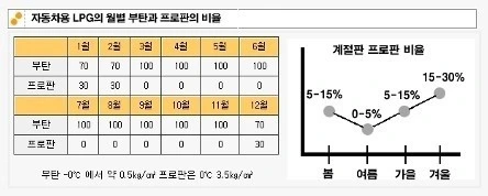 가스로 분사되는 LPG 엔진의 경우도 계절의 영향을 받는다. 똑같은 LPG이지만 가정용으로 쓰이는 프로판 가스와 놀러 가서 부스터에 쓰는 부탄가스는 물성치가 다르다. 더운 여름에는 일반적으로 부탄 100%의 형태로 공급되다가 온도가 낮아서 기화가 잘 안 되는 겨울에는 프로판 30% / 부탄 70%의 비율로 공급된다. 이 비율은 계절에 맞춰서 서서히 조절되기 때문에 일상적인 주행을 하시는 분들은 연료 탱크 내에서 자연스럽게 바뀐다. 다만 여름 초가을까지 사용하다고 오랫동안 차를 쓰지 않으셨다가 겨울에 시동을 거시면 시동이 불안할 수 있다. 연료의 비율 문제일 가능성이 크니 가까운 충전소에서 겨울에 맞는 연료로 충전해 쓰면 된다.