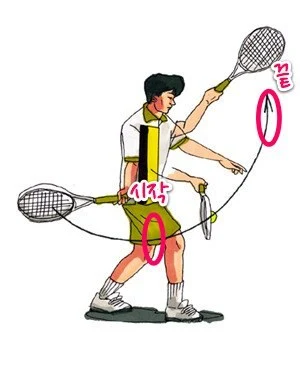 넷째, 맞는 순간에 손목의 사용은 줄이고 채를 그대로 앞으로 쭉 던진다. 오는 공이든 멈춰 있는 공이든 맞는 순간의 충격은 크다. 손목으로 무언가 하기보다는 다리로부터 시작한 중심 이동을 허리 어깨를 통한 회전으로 전환하고 팔과 손목은 부드럽게 채와 공에 전달하는 역할만 한다. 이러면 임팩트 순간에 불필요한 좌우 회전이 최소화돼서 훅이나 슬라이스를 줄일 수 있다.