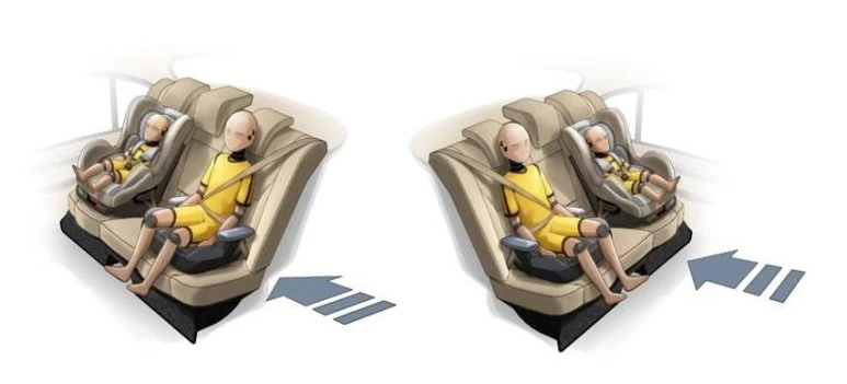 무엇보다도 아이들에게 있어서 충돌의 충격보다 앞 좌석 에어백에서 받는 충격이 오히려 더 치명적이다. 충돌을 감지하면 화약이 폭파해서 전개되는 에어백은 출시 초기에는 너무 팽창 압이 강해서 작은 사고에서도 작동했다가 에어백 때문에 발생하는 상해 사고가 빈번했다. 이를 보완한 2세대는 에어백은 팽창 압력을 30%가량 줄이고 대신 안전벨트 착용을 의무화하는 것으로 보완되었다. 요즘은 스마트 / 어드밴스 에어백이라고 해서 충돌 속도에 따라 그리고 안전벨트에 걸리는 장력들을 측정해서 에어백의 팽창률과 전개 시점을 조절하는 기능이 추가되어 있다.