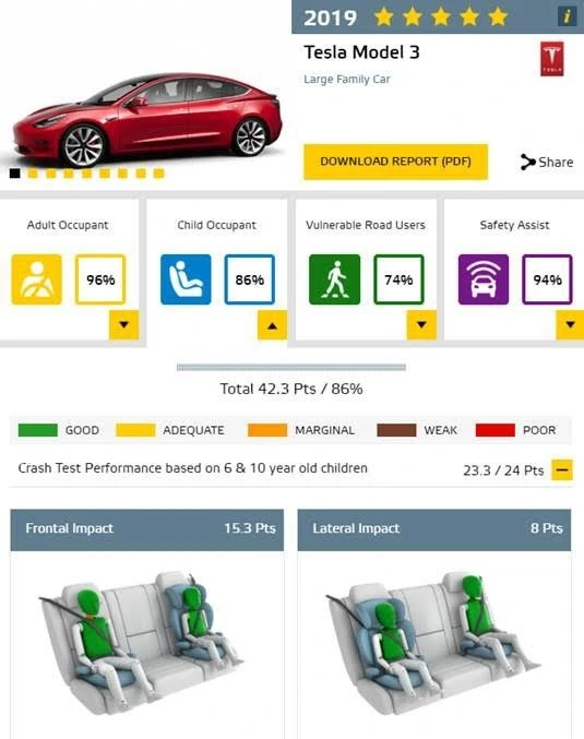 2019년 진행된 Model 3 NCAP Test 결과 - NCAP 홈페이지 참조