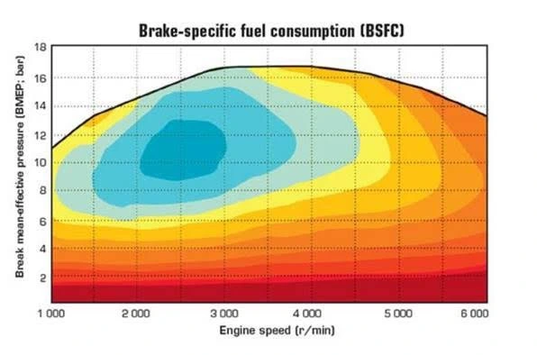 대신 같은 일을 하는데도 더 많이 회전해 주니까 마찰이나 엔진으로 공기를 흡기하는 Pumping으로 소비되는 에너지가 많다. 자연스럽게 연비는 더 손해를 볼 수 밖에 없다. 실제로 같은 토크를 내는데 필요한 연료량을 정리한 BSFC (Brkae Specific Fuel Consumption) 그래프를 보면 1600 ~ 2000 rpm에서 최적점이 유지되는 것을 볼 수 있다. 연비를 위해서라며 최대한 높은 단수를 유지하는 것이 중요하다.