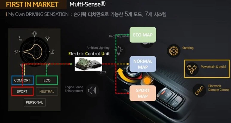 사람들마다 운전하는 성향이 다르니까 빠른 속도로 잘 달리기를 원하는 사람들은 스포츠차를 사겠지만 일상 주행에서는 연비가 걱정되는 사람도 있을 거다. 이런 소비자의 이중적 욕구를 충족시키기 위한 Option이 멀티 센스 모드다. 한마디로 버튼 한 번이면 차의 모드가 바뀌는 거다. 가장 큰 차이는 앞서 이야기한 대로 자동 변속기의 변속 패턴을 조정한다. Sporty 버전일 때는 변속을 최대한 늦게 해서 높은 RPM을 유지하도록 하게 하고 ECO Mode일 때는 최대한 변속을 빨리 해서 낮은 RPM에서 운전이 되도록 유도한다.