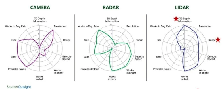 카메라는 라이더에 비해 싸고 설치가 용이하지만, 안개가 끼거나 어두운 밤에는 제한적이고, 거리를 정확히 측정하는 것이 아니라 보이는 영상을 분석해서 산출해야 한다. 그리고 블랙박스 사고 영상에서 단골로 나오는 것처럼 큰 차 옆 그늘에 숨어 있다 직진하는 차를 보지 못해 발생하는 교차로 사고처럼 빛의 명암에 영향을 많이 받는다.