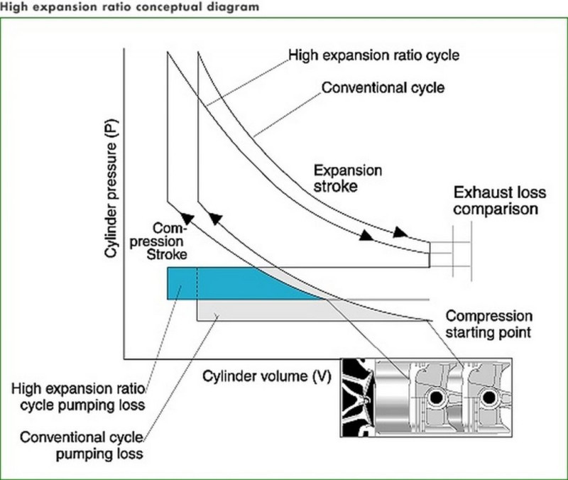 이 압축비가 클수록 연소를 통해 발생한 에너지가 바로 운동 에너지로 전달되는 효율이 좋아진다. 열역학에서는 복잡한 수식을 통해서 PV 선도 상에서의 면적이 더 넓어진다고 증명하는 방법도 있지만, 쉽게 설명하면 폭발이 한순간에 일어나기 때문에 에너지를 다른 쪽으로 뺏기는 열손실이 적고, 폭발이 일어나는 동안 피스톤을 밀어주는 길이가 길기 때문에 폭발 에너지를 온전히 회전 에너지로 전환이 가능해진다. 같은 연료를 태워도 손실이 적으니 효율이 좋은 것이다.
