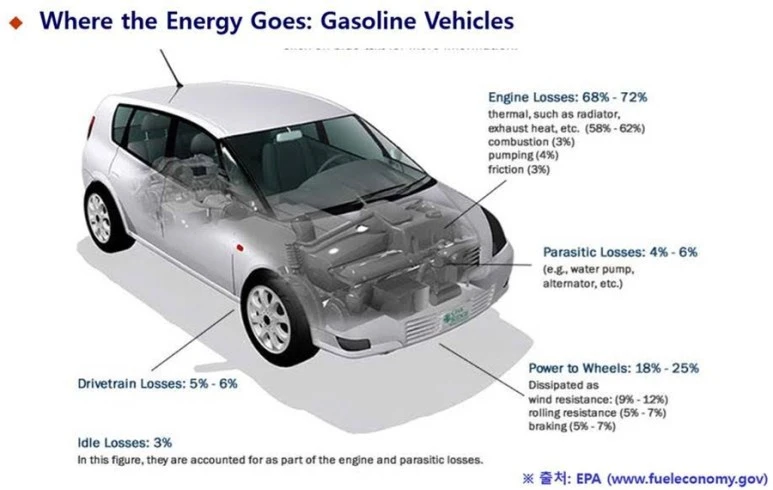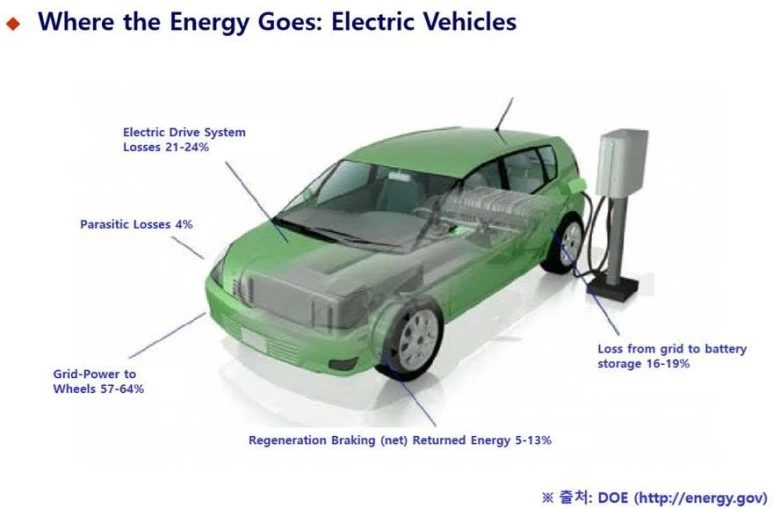 실제 연료로 발전하는 화력 발전소의 효율이 최대 50% 정도임을 감안하면 과연 전기차가 동일한 화석 연료를 넣었을 때보다 더 효율적이라고는 이야기하기는 어려울 것 같다. 배터리 때문에 더 무겁고 트랜스 미션이 없어 고속 주행 마찰력이 더 큰 약점이 뚜렷하다. 대략 가솔린 엔진 정도가 되는데 실제 닛산에서 엔진은 전기를 발전시키는 용도로만 쓰고 배터리로 모터를 돌리는 Hybrid 형태도 개발했었지만 크게 연비 개선 효과가 없어 대중화되지 못한 케이스도 있다.