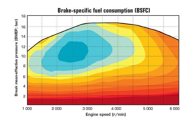 그러나 이 수치는 이상적인 조건에서 상대 비교한 값이고, 자동차의 효율을 상징하는 연비는 운전 패턴과 더 큰 연관이 있다. 저속으로 갈수록 공기를 빨아들이고, 압축하는 데 힘이 많이 들고, 고속으로 갈수록 관성은 압축 행정은 원활한 대신 고속으로 움직이는 마찰로 손실되는 열 에너지가 커지게 된다. 그래서 BSFC (Brake Specific Fuel Consumption) MAP이라고 해서 엔진 RPM당 총 Torque에 따라서 동일한 일을 하는데 얼마나 많은 연료가 필요한지가 실험을 통해 측정해 놓은 데이터를 보면 1600 ~ 1800 rpm 부근에 최대 토크의 20~30% 지점이 가장 효율이 좋은 것으로 나온다.