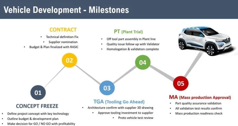 전기차를 포함하여 모든 양산 차량을 개발하는 동안 크게 다섯 번에 걸쳐서 진행 상황을 점검하고 다음 단계로 넘어갈지 판단하는 마일스톤이라는 이벤트를 갖는다. 각 마일스톤마다 개발을 담당한 연구소, 생산을 담당하는 공장, 부품업체를 상대해야 하는 구매, 고객들을 직접 상대해야 하는 판매와 AS, 진행에 필요한 자본의 흐름을 확인하는 재무 등 각 부서들의 해야 할 일들이 정의되어 있고, 이를 점검하고 확인하는 품질이 승인을 해야 통과하는 구조를 가지고 있다. 한 마디로 매번 시험을 거쳐 통과해야지만 완성된 차가 나오는 셈이다.