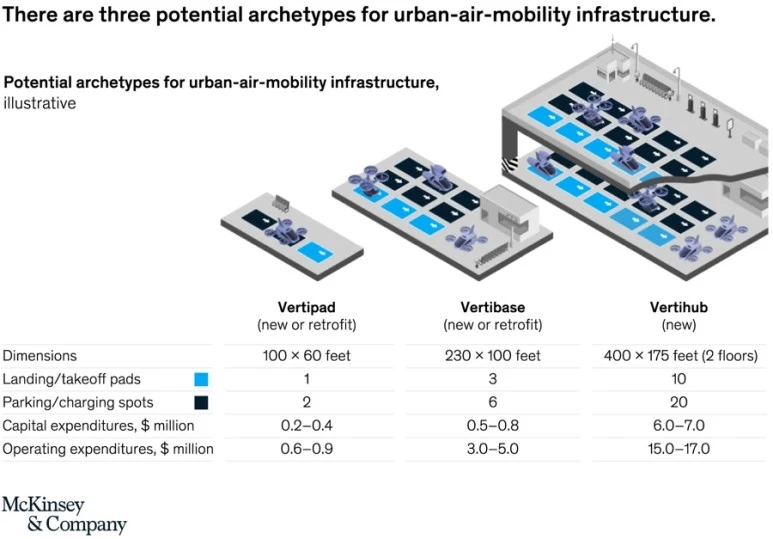맥킨지에서 2021년에 발표한 UAM관련 보고에 따르면 10대 정도 이착륙 장에 20대 정도 동시 주차 가능한 허브가 짓는데 최소 200억, 운영하는데 매년 200억 정도가 들 것으로 예상하고 있다. 이 정도 투자비를 감당할 정도가 되려면 이용 요금이 상당하거나 이용량이 많아야 하는데 현재로서는 그 가격과 수요의 균형을 맞추는 일이 쉽지 않아 보인다.
