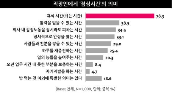 한 설문조사에서 직장인들은 점심시간의 의미를 주로 휴식과 재충전이라고 답했어요. 그리고 보통 휴식은 자기만의 시간을 보낼 때니까 혼자 따로 밥 먹는 것이 제일 목적에 맞는 방식일 듯합니다. 코로나를 거치면서 식사에 대한 회사 분위기도 많이 바뀌어서 안전을 위해서도 혼자 밥 먹는 것이 오히려 권장되기도 하고, 식당에서도 거리를 두고 대화도 삼가게 되었죠. 나만의 시간을 나만의 방식으로 보내는 것을 서로 인정해 주는 문화가 자리 잡는 것 같아 다행입니다.