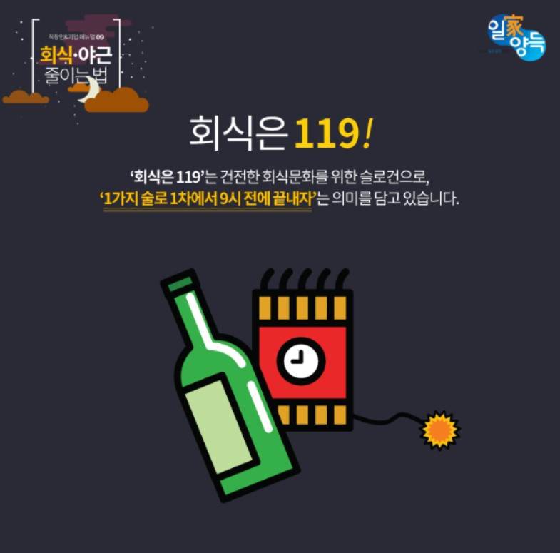 그러나 시대는 변했습니다. 평생직장이라는 말은 사라지고 코로나도 겪은 지금의 회식 모습은 그때와 비교하면 많이 바뀌었습니다. 1가지 술로 1차만 9시 전에 끝내자는 고용 노동부의 119 캠페인에서도 알 수 있듯이 회식은 이제는 지나치면 해로운 이벤트로 인식됩니다.